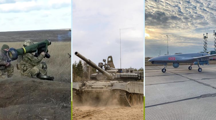Ukraine is using so-called “attack drones” made by the U.S. and Turkey to destroy Russian tanks and artillery. These weapons tend to be small – for example, the Switchblade drone that the U.S. is sending is 2 feet long and weighs 6 pounds. They range in capabilities but can destroy Russian tanks and artillery emplacements. Additionally, they were used to distract Russian missile defenses as decoys when attacking Russian ships.